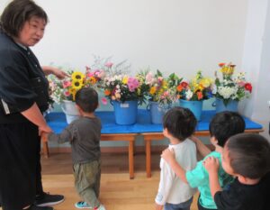 この日は、各ご家庭から持ち寄った花で花束を作り、いつもお世話になっている病院、警察署、消防署など日ごろお世話になっているところへ、年長、年中組のリーダーさんと一緒に感謝の気持ちを届けました。