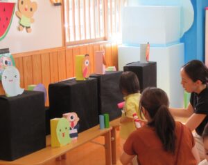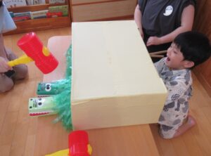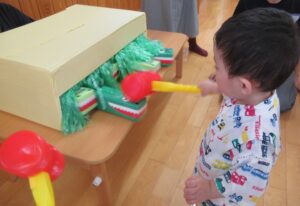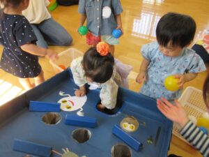 ボール転がし・きんぎょすくい・ボーリング・射的・ワニワニパニック・・どれも楽しそうなお友だちとお家の方の笑い声が響いていました。