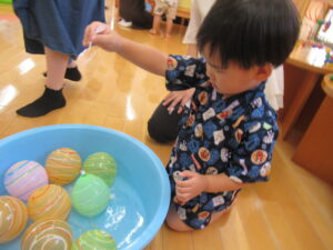 水を汲んだり流したり、水風船を水に落としてみたり・・・とても楽しかったです。