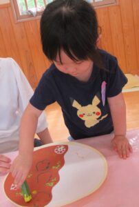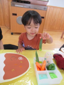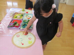お野菜でスタンプしてカレーライスを作ったり、いろいろなスタンプでランチョンマットを彩って遊びました。