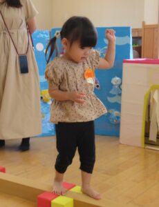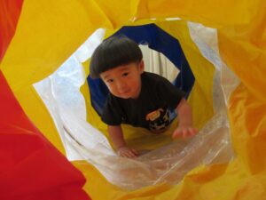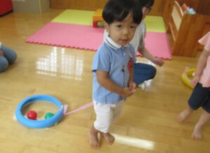 よういドン!とかけっこをしたり、お家の方と一緒にお船に乗ってさかなつりをしたり、身体をたくさん動かして楽しみました。サーキットでは平均台やトンネルなどにも挑戦し、お友だちもお家の方も笑顔いっぱいでした。
