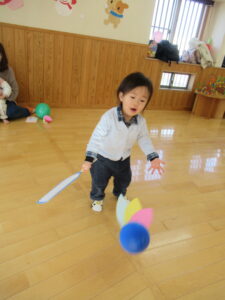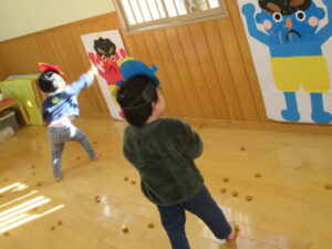 豆まきが終わった後の自由遊びでも、野菜嫌い!というと鬼が現れるごっこ遊びで大盛り上がりでした。