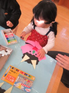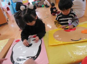 お正月の遊びや、節分に向けて鬼のお面を作り、一足早い豆まきを行いました。