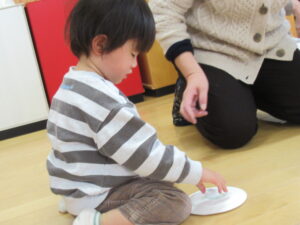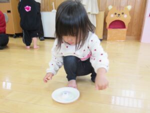 紙皿を彩り、コマを作りました。くるくる回るコマをとても喜んで、何度も回して遊ばれていました。